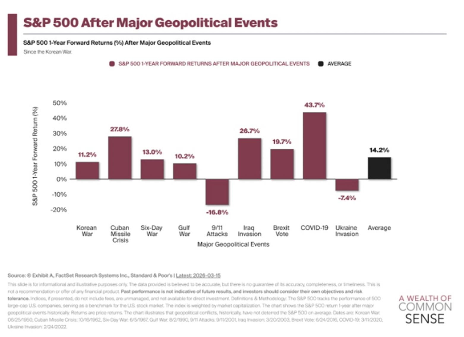 On the one-year anniversary of “Tariff Liberation Day,” a chart we’ve been reviewing this week tracks S&P 500 performance in the 12 months following major geopolitical events going all the way back to the Korean War.